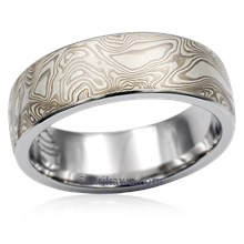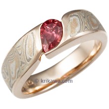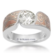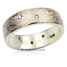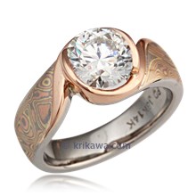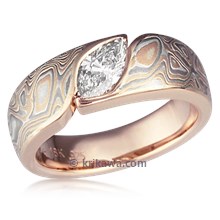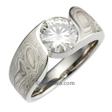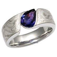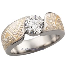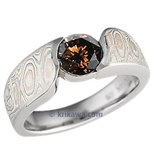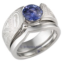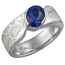 This wood-grain ring is set with a Celestial Compass yellow sapphire cut by gem artist Larry Woods. With White mokume gane.
