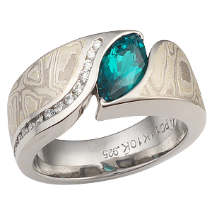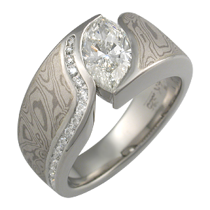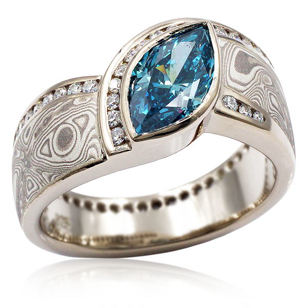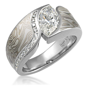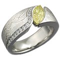 This striking "Platinum" mokume and 0.78 ct fancy yellow marquise diamond ring sparkles with white accent diamonds. The width tapers from 5mm at the palm to 7mm on top.