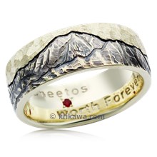 The hand-carved mountain range that wraps the band has a darkened groove that separates it from the machinist textured sky, This band measures 6mm in width.