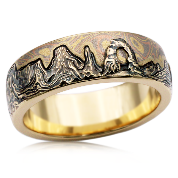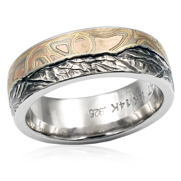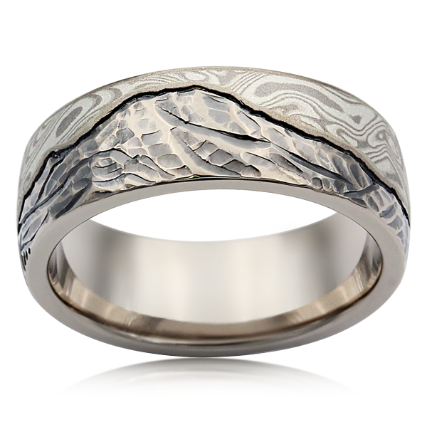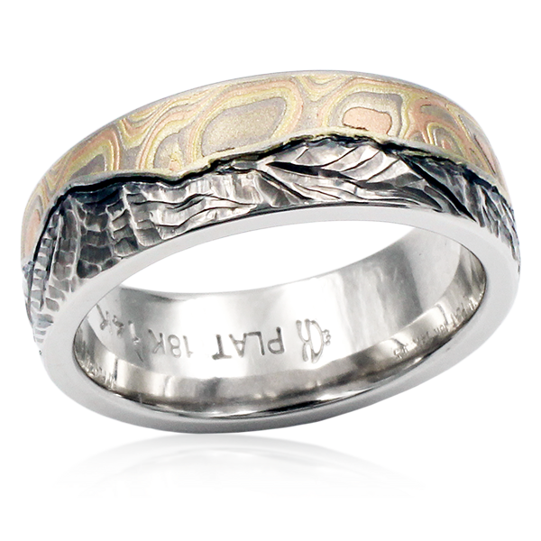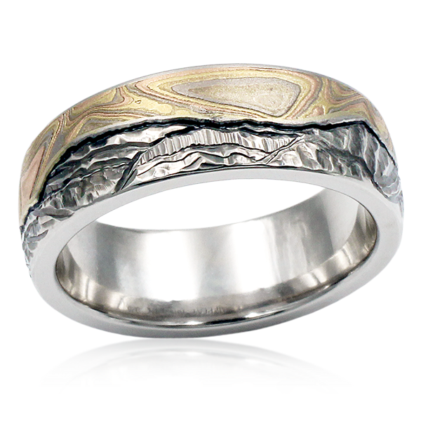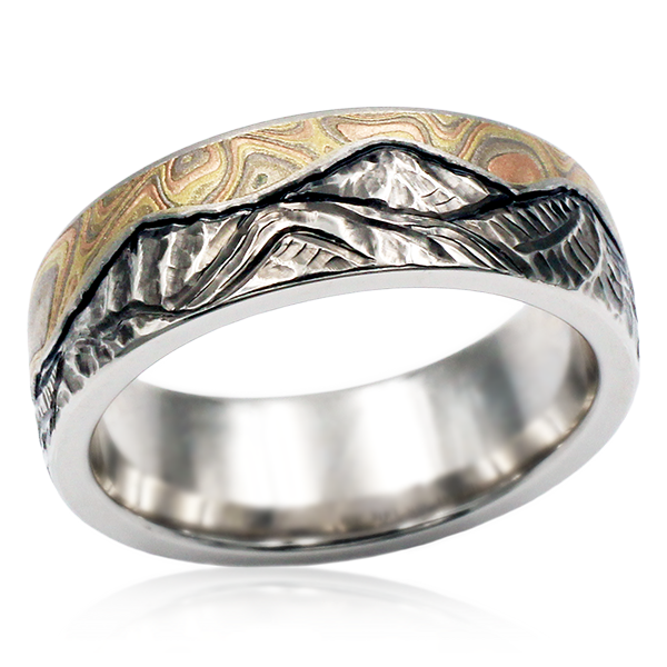 The hand-carved mountains of this wedding band are beautifully shadowed and contrasted with a darkened horizon line that separates the mountains from the swirling sky of Champagne Mokume Gane. The warm tones of the natural white gold band adds natural dimension and realism to the mountains. The band pictured in 8mm in width.