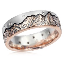 Inspired by your favorite place is our hand-carved mountain range with a stunning mokume inlaid sky. The slender band carries an organic pattern resembling airy clouds. Maybe you prefer a star-studded night sky. Your diamond center stone shines brilliantly as sun or moon in your unique design, artistically immortalizing your cherished place. Perfect for an alternative style of engagement ring, as well as wedding band.Shown in platinum with autumn mokume and a 0.11ctw lab-grown diamond.