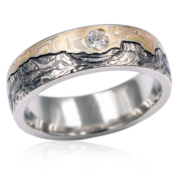 Our beloved Mountain wedding Band with Mokume Sky gets a brilliant bit of sparkle with a flush-set diamond that gleams above the peaks like the sun or moon over a distant summit. The flowing woodgrain pattern adds natural movement, echoing clouds, wind, or water depending on how the light catches it.