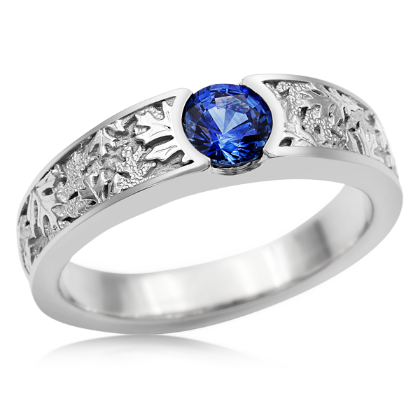 Shown with a one carat round diamond and blue sapphire accent stones in platinum.