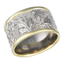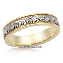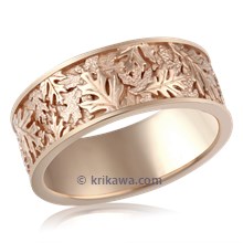 Layers of oak leaves in relief cover the entire surface of this wedding band. Evoking long, romantic walks in the woods, this nature-inspired ring can be made in the precious metal and width of your choice.- Choose your metal in the dropdown below for pricing and colorizing