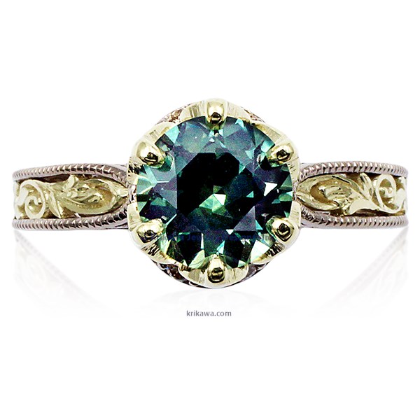 Shown in 14k white gold and green gold with a 1.42ct Montana sapphire with diamond accents.