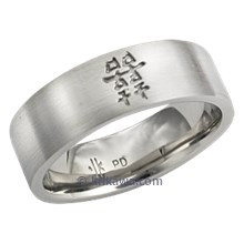 This wedding ring has been personalized with the Om symbol for the Hindu religion. It has a round profile.