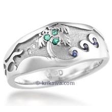 Palm Tree Beach Wedding Band 2 captures the magic of the ocean and the romance of starlit shores. A carved palm tree rises beside gently rolling waves, while a whale tail arcs above the surf, symbolizing freedom, adventure, and deep connection. Diamonds twinkle like stars in the night sky, adding sparkle and sentiment to this nature-inspired design.