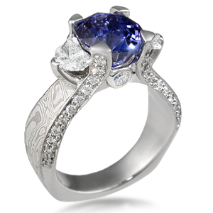 This wood-grain metal engagement ring is topped with a lab-created princess-cut blue sapphire.