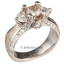 This luxury engagement ring is a hybridization of two of our popular ring styles. The curvaceous form of the band was modeled after the Mokume Ribbon, and the finger hole profile side was based on the Juicy Light. 0.70 ctw ideal cut accent diamonds.*To maintain the signature juicy look, the suggested center stone shapes are square cushion and round gems. Stones have a required size to keep the juicy profile. Round stones need to be at least 8mm (2-carat) and Square Cushion needs to be at least 7mm wide. With smaller center stone sizes, we recommend adding a diamond halo to achieve the signature flair. Please inquire about other stone shapes.