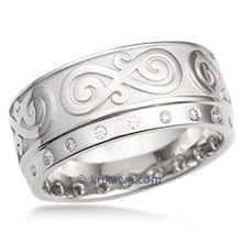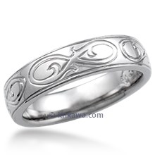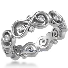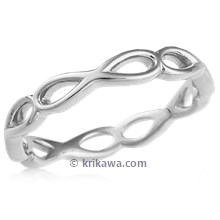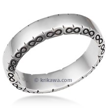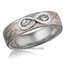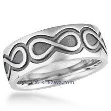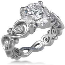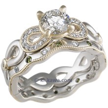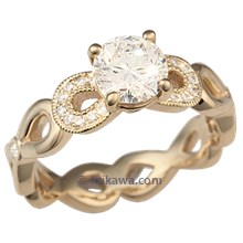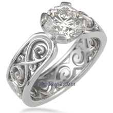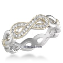 This engagement ring features infinity symbols around the band. The infinity beneath the head has diamond pave and millegrain detail. The white pave diamonds swirl in the infinite, supporting a secure, four prong setting. This ring is both sturdy and delicate; strong enough for an active lifestyle, and beautiful for even the most feminine of brides. This would look gorgeous with rose gold accent metal and pink accent diamonds!Shown in palladium and yellow gold, with a 0.70 carat round brilliant cut diamond center.