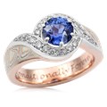 In this variation of our Pave Swirl Mokume Engagement Ring, the band was handcrafted in platinum and 14k rose gold with our Champagne Mokume Gane inlay. The center stone is a remarkable 1.39ct color-change sapphire. Wrapping around the sapphire and tapering down the sides of the ring are 0.30ctw diamonds.