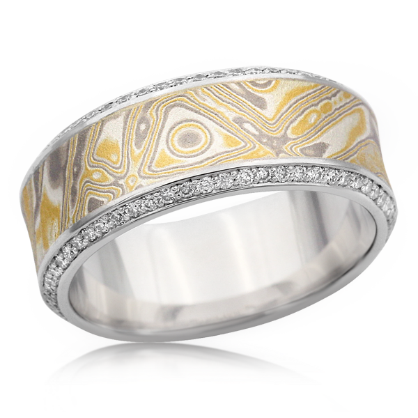 This unusual wood-grain metal wedding band has hand-cut pave beading along its edges. The band is slightly concave. Priced with 0.53 carat total weight diamonds or sapphires, and your preferred mokume type. Great cigar band!