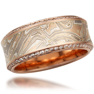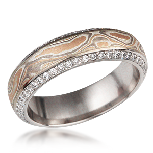This pave diamond accented wedding band was done in platinum and our Summer Mokume. The band measures 8mm in width and consists of 0.49ctw white diamonds.