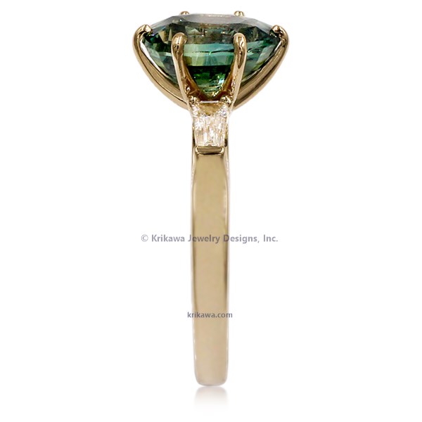 Everyone will shout “Tres chic!” when they see what’s on your finger. This classic and timeless design is easily customized to showcase your favorite stones. The prong setting allows light to shine through and creates prisms of light. The baguette-shaped stones give a fresh perspective on the accompanying accents. The band is 2.5mm width at the palm.Shown in 14k yellow gold with a 4-carat oval sapphire.