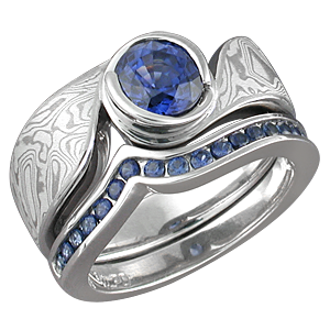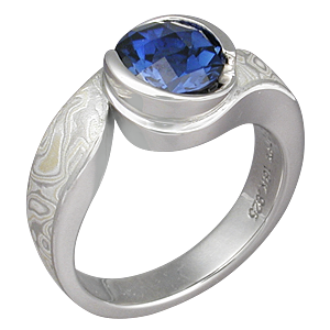 This mokume solitaire engagement ring displays a one carat diamond. It features the tricolor Platinum mokume gane. A small blue sapphire flush set on the finger hole profile makes this ring unique.