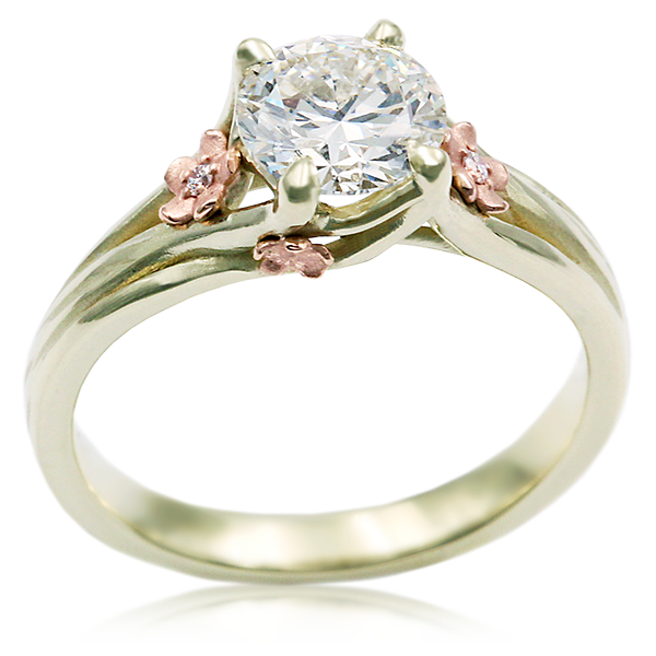 Get ready to embrace the delightful spirit of spring with our hand-textured floral engagement ring. This whimsical beauty features petite plum blossoms scattered across the band, creating a truly enchanting display. A beautiful center stone shimmers alongside the playful plum blossoms, adding a touch of sparkle and elegance. Sculpted branches reach up, gracefully cradling the center stone in a charming four-prong setting. Get ready to bloom with joy and let this playful ring capture the essence of your everlasting love. The band is 2.5mm width at the palm.Shown in 14k white gold with 14k flowers, 1.5ct radiant diamond and sapphires.