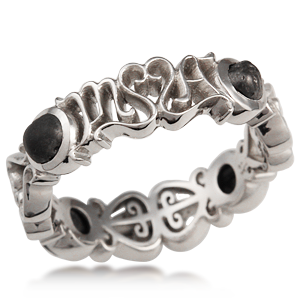 "Odo nnyew fie kwan"--"Love never loses its way home." The motif that makes up this unique wedding band is an Adinkra symbol from West Africa. Ideal cut diamonds in bezels separate each symbol.