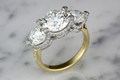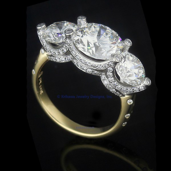 Shown in yellow gold and platinum, with a three carat round diamond center and one carat round diamond side stones.