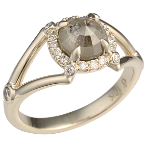 This edgy engagement ring was designed for a rose-cut raw diamond. The center stone is secured by claw-like prongs, and a halo of paved diamonds surround it.The band is 2.5mm width at the palm.Shown in platinum with a 3.88 carat rose cut diamond center.