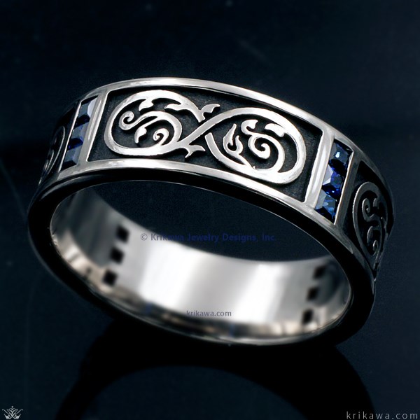 A unique wedding band that incorporates a Medieval sword inspired eternity symbol in the band. Eight channel set princess cut diamonds are set in pairs evenly spaced around the band. 6mm wide. 0.64 ctw ideal cut accent diamonds. Please inquire for pricing on wider rings.- Choose your metal in the dropdown below for pricing and colorizing