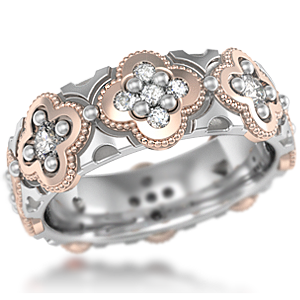 A romantic echo of vintage artistry, the Quatrefoil Diamond Wedding Band features a repeating floral motif framed by delicate millegrain beading. Each petal glimmers with hand-set diamonds, blossoming across a warm, polished band that radiates timeless grace.