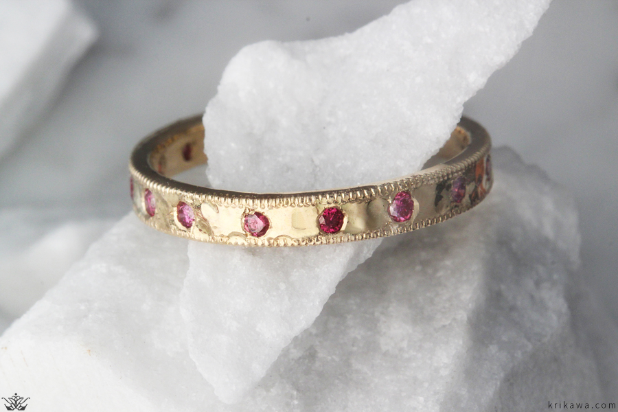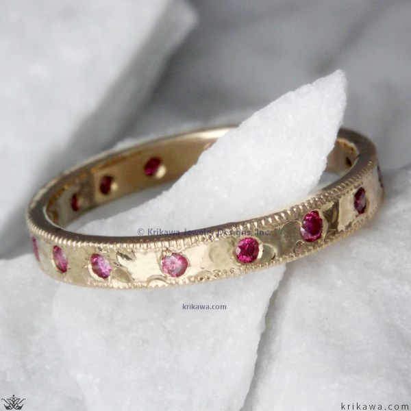 The details of this rustic style wedding band are amazing! The band is heavily textured with a round hammered that adds character and dimension to the band. Diamonds are flush set around the band at even intervals. Lastly, decorative hand-rolled millegrain is added to the edges of the band.