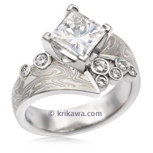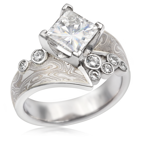 Delicate bubbles of bezel-set diamonds gracefully complement the mokume waves that gracefully ascend from this opulent band, enveloping the center stone. This organic and intricate design masterfully showcases your center gem, elegantly elevated above the band within our timeless four-cut-out prong setting. The mokume gane, reminiscent of cascading ribbons, forms the band with a tapering effect, and carefully placed diamonds in assorted sizes are thoughtfully interspersed, accentuating the graceful lines of this enchanting design.Shown in 14k pd white gold and 14k rose gold with Autumn mokume, 1.74ct yellow diamond, and accents with lab sapphires and diamonds.
