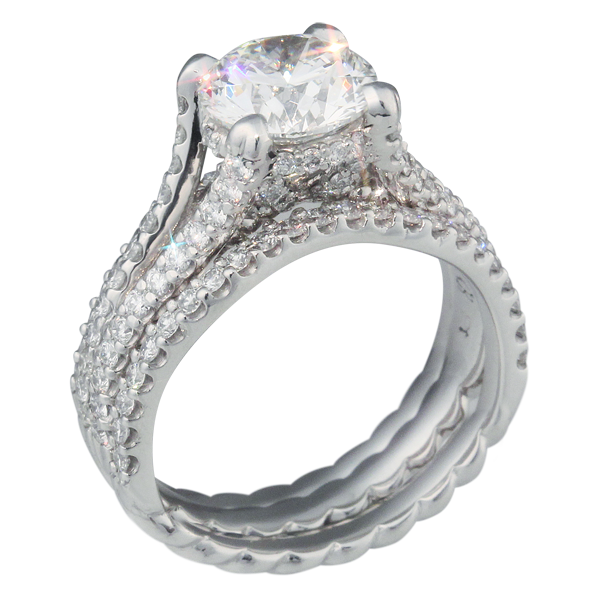 This gorgeous engagement ring has a pave band with a rope twist at the bottom. This ring has a juicy profile that is tapered and splits into high-arched prongs. Under the center stone, there is a secret halo lined with diamonds! The band is 2.5mm width at the palm.Shown in platinum with a 1.5-carat round brilliant-cut diamond.