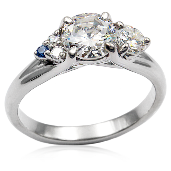 Shown in 18k yellow gold with a 6.75mm moissanite center stone, 4mm moissanite side stone, and 0.09 ct accent stones.