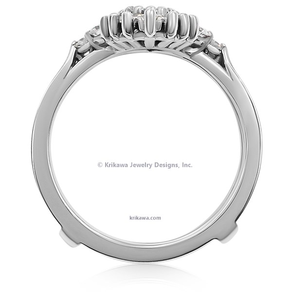 This work of art is a variation of our Marquise Baguette Diamond Enhancer. With timeless art deco style, this vintage design transports you back in time. Created to embrace your engagement ring, this enhancer forms a stunning halo of brilliant starlight around the center stone. Your engagement ring fits seamlessly within the open double band, with the center setting beautifully highlighted by the baguette diamonds. Add a pop of color by replacing the end diamonds (which are round) with color diamonds or gemstones! It's an ideal way to elevate an existing ring or complete a bridal set.