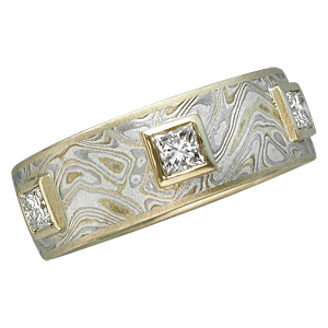 This designer wedding band is inlaid with Summer mokume and has a heavy etch.