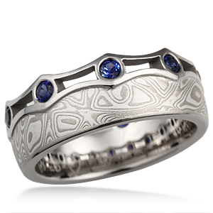 This wedding band has etched Summer mokume gane in yellow gold and 2.5mm rubies in palladium. Size 11.