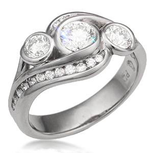 A trio of brilliant, round, bezel-set gems in a wider band are the focal point of this stunning modern engagement ring. Choose a different color for the center stone or smaller side stones to really showcase its beauty!Shown in 18k yellow gold with a 5mm round diamond center and 3mm round diamond side stones.