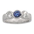 This custom three stone engagement ring is set with a 0.57 ct blue sapphire and two white diamonds. With White mokume gane in palladium.