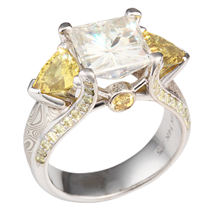 This luxury engagement ring is a three stone version of the Juicy. In the main example, a princess cut diamond is adorned by two trillions. Pave-set accent diamonds graduate in color halfway down the band. Mokume gane is inlaid around the band. Priced with all-white ideal cut accent diamonds.*To maintain the signature juicy look, the suggested center stone shapes are square cushion and round gems. Stones have a required size to keep the juicy profile. Round stones need to be at least 8mm (2-carat) and Square Cushion needs to be at least 7mm wide. With smaller center stone sizes, we recommend adding a diamond halo to achieve the signature flair. Please inquire about other stone shapes.
