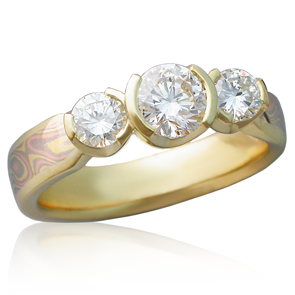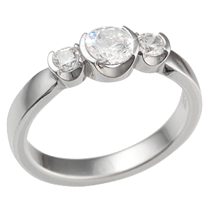 This contemporary three stone engagement ring has semi-bezel settings for round diamonds or gemstones. The bezels graduate in size and connect to a band with a uniform width.Shown in 14k rose gold with a 6mm round diamond center and 4mm round diamond side stones.