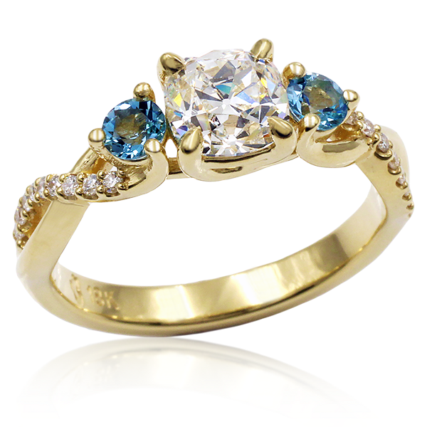 A simple three-stone engagement is enhanced by a twisting strand of diamonds. This engagement ring features a prong set center stones framed by smaller round cut side stones. The twisting band features a plain polished strand interwoven with a pave set diamond strand. Customize this design in the metal, diamonds, and gemstones you want with endless possibilities to personalize this engagement ring just the way you want.Shown in 14k palladium white gold with moissanite.