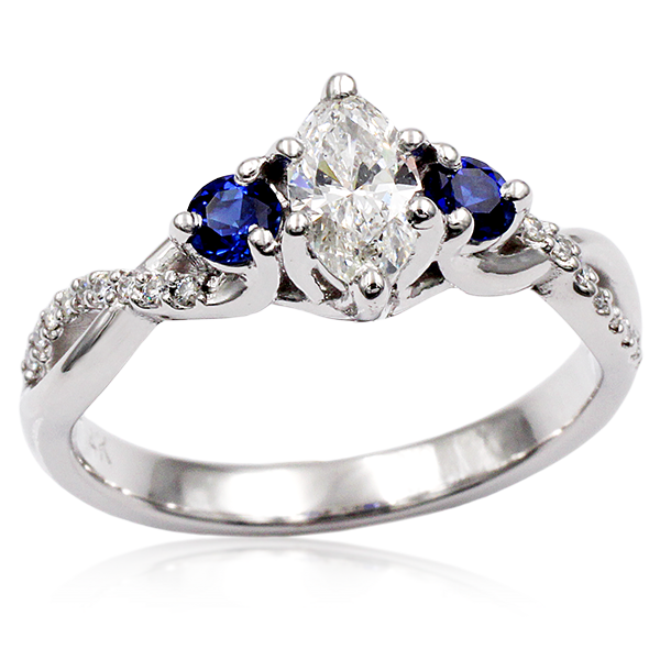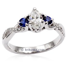 Prepare to be dazzled by the elegance of our three-stone engagement ring, where timeless beauty meets contemporary flair. Watch as a captivating twist of diamonds weaves its magic around the prong-set center stones, creating a mesmerizing masterpiece. Framed by smaller round-cut side stones, this ring is a symphony of sparkle and sophistication.Shown in 18k yellow gold with lab diamonds and aquamarines.