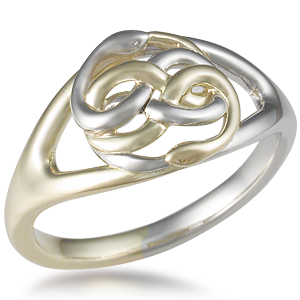 This sculptural ring has a Tibetan-inspired knot framed by the split shank. Four accent stones are set around the pattern.