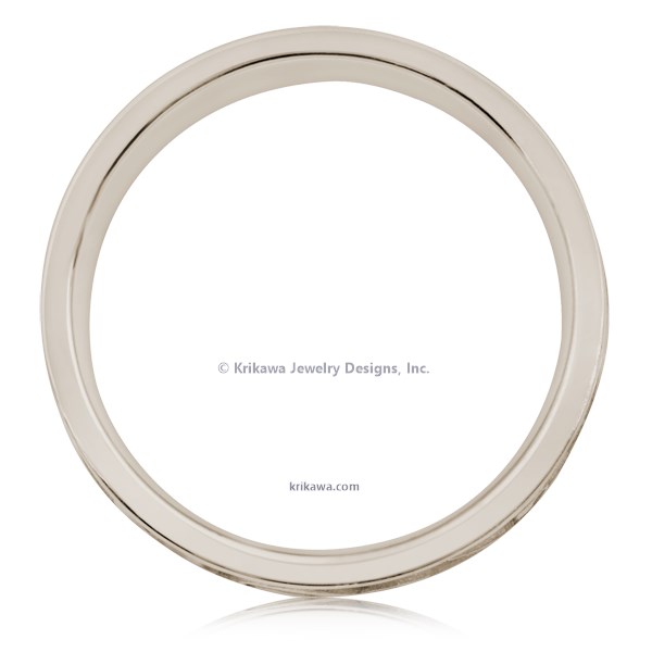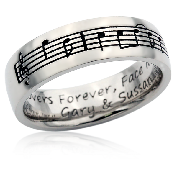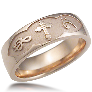 Celebrate your love of music with this musical symbol wedding band. Polished treble and bass clef symbols alternate around the band and sit in relief to the matte recessed background for contrast and dimension. Shown here in a 6mm wide band.