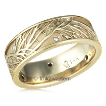 This nature band is accented with 0.10ctw diamond flush set around the band. The branches are raised and polished above a darkened matte recess background for added contrast and dimension.