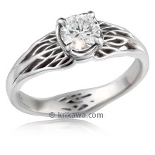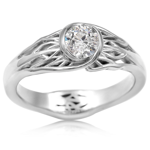 A perfect engagement ring for the imaginative partner. Drawn from the misty woods of ancient forests, intertwined branches are sculpted. The organic tree design shows an unexplored path, as you both travel to your next adventure. Shimmering is a beautiful center stone of your choice mounted into the curved bezel. Carved at the palm side of the ring is a tangle of roots. This root system represents your stability and strength together. The band is 4mm width at the palm.Shown in platinum with a 0.72ct round black diamond.