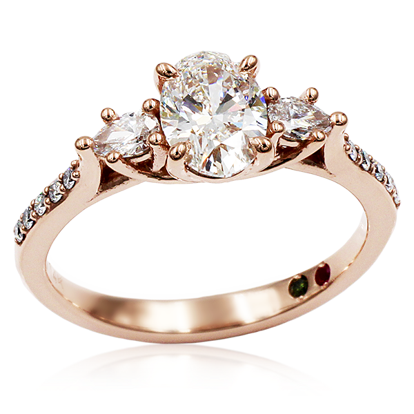 An organic engagement ring inspired by classic designs. The trellis consists of interwoven prongs that represent your eternal union. A slim band carries three stones of your choice. Imagine the possibilities with your choice of metal color and gemstones. The band is 3mm width at the palm.Shown in 14K Rose Gold with a 1.40ct oval lab diamond, 0.15ct lab diamond side stones, and lab diamond accent stones.