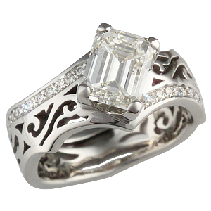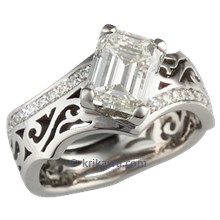 This ring is shown with a custom-made contoured diamond pave wedding band.