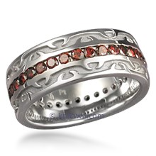 This stylish yet elegant Tribal Thorn Wedding Band is made with color enhanced red diamonds in a platinum band. The recesses have been darkened for heightened contrast.