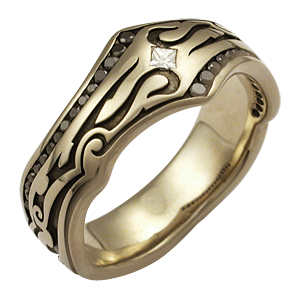 This phenomenal wedding band for men was inspired by tribal tattoo imagery. Over one quarter carat of black diamonds is channel set in the ring, with a white princess cut diamond flush set diagonally in the center. The recesses are darkened. Truly a stand apart ring. The white center diamond is included in the price. To choose different colors for the accents in the channels, just select your choice of fancy diamonds or sapphires! For a different center stone, please inquire for pricing. A statement ring at 11mm top width and 7mm palm side width and as always, a comfort fit.