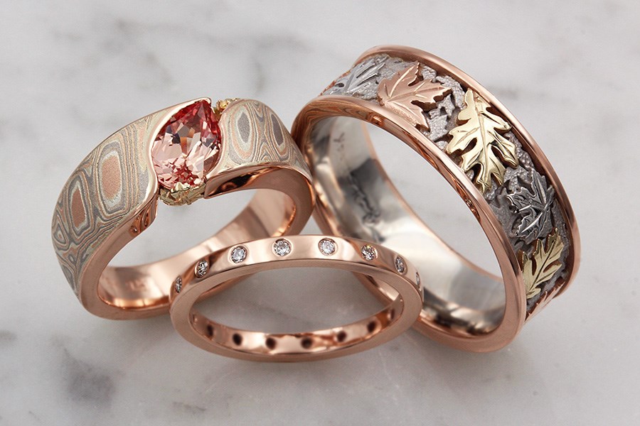 Celebrate life’s changing seasons with our Tricolor Oak and Maple Leaf Wedding Band. Interwoven oak and maple leaves encircle the band in a dance of texture and form, symbolizing strength, growth, and enduring love. Each leaf is sculpted in different hues, creating a rich, layered design reminiscent of autumn light filtering through the trees. Shown in three contrasting metal tones, this ring is a timeless ode to the beauty of a love that evolves through every season.