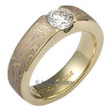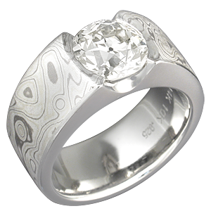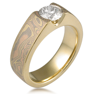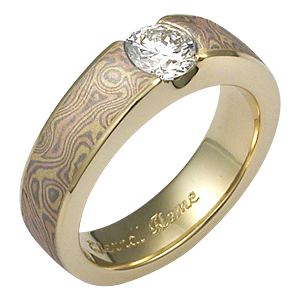 A round brilliant cut diamond is flush set in a band of Winter mokume.
