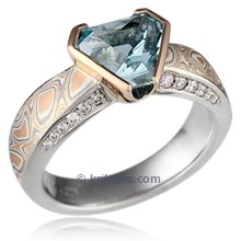 This unique engagement ring was handcrafted in 14k white gold and 14k rose gold. The center stone is a 1.28ct cut-corner trillion cut sapphire with 0.17ctw diamond accents. The band is inlaid with Champagne Mokume.