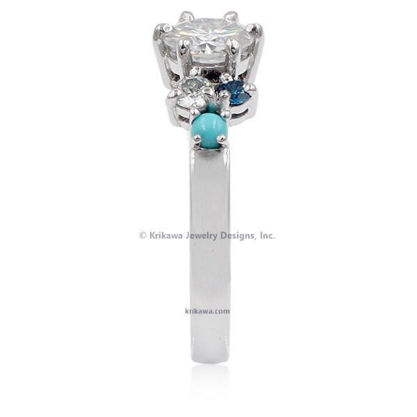 Shown in platinum with a 2.5mm band. Stones include a 0.71ct Moissanite with ocean blue diamonds, white diamonds, and turquoise accent stones.